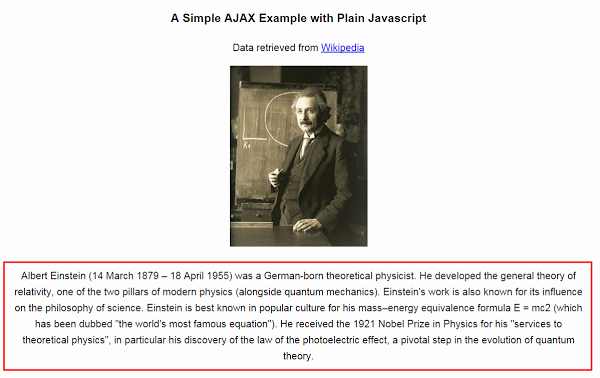 <div> <img src="Einstein.jpg" alt="Einstein"> <button id="request">Learn more about Einstein</button> <div id="bio"></div> </div> |
